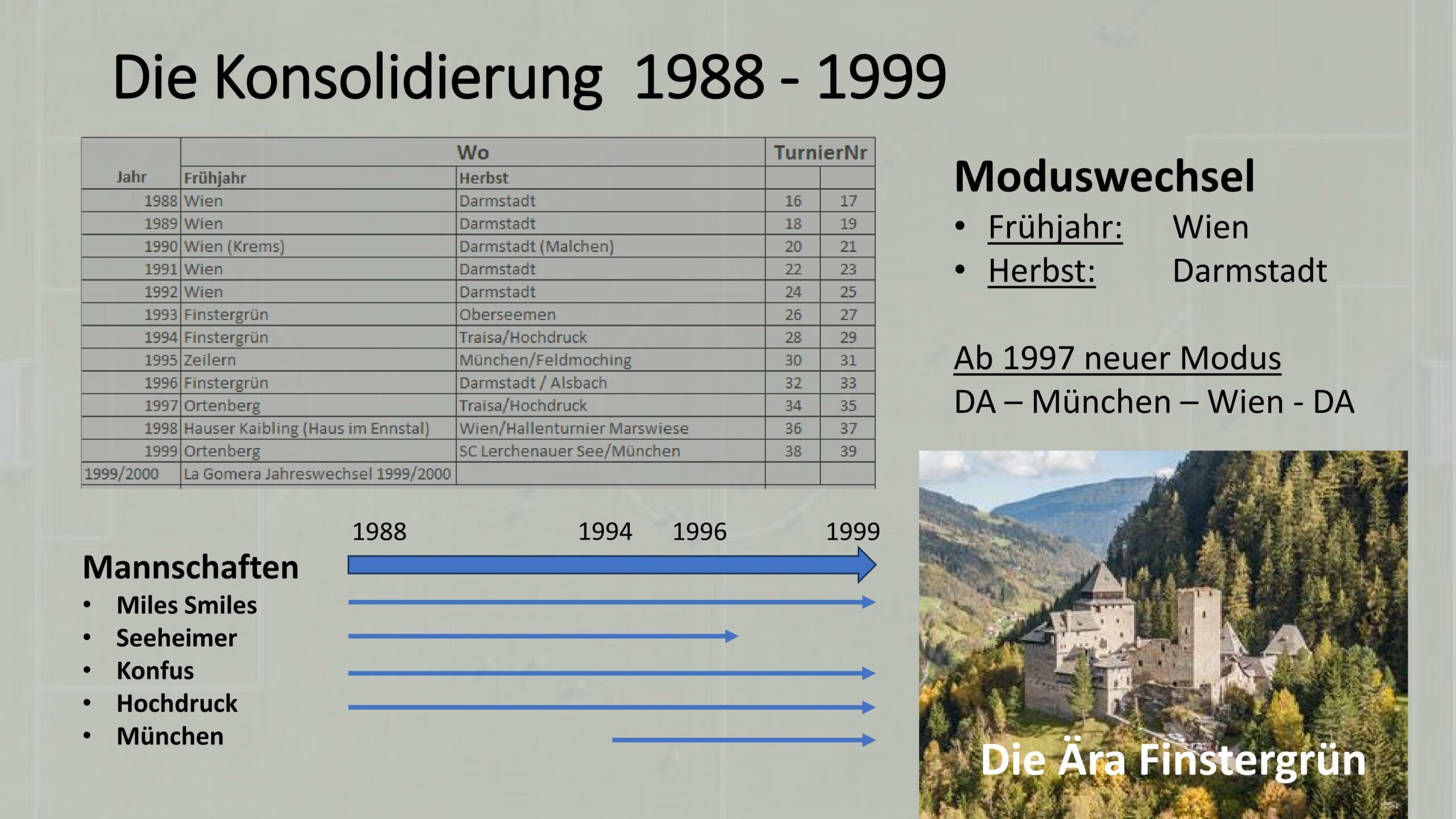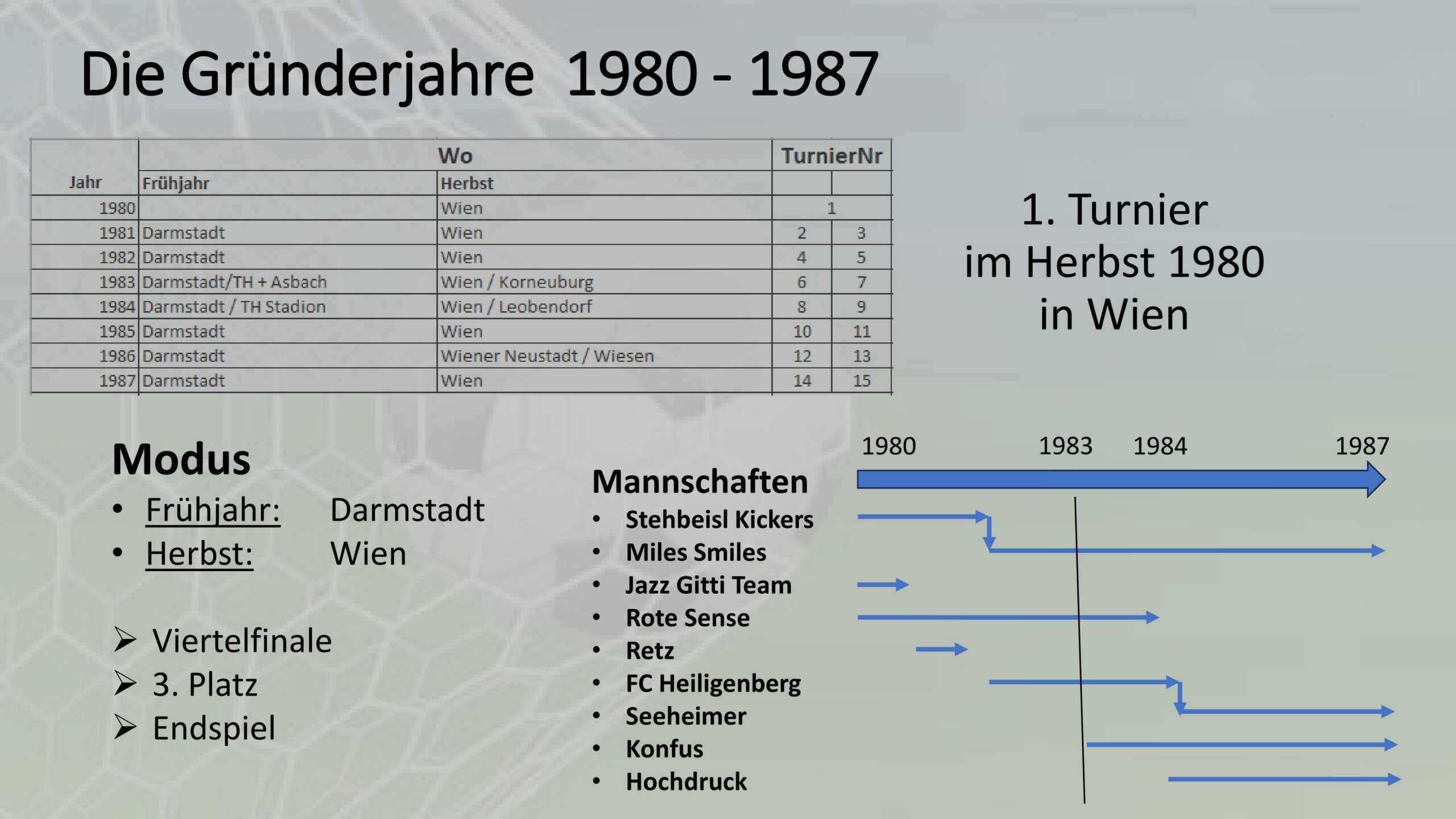 Seit 46 Jahren gibt es diese, jedes Jahr zweimal stattfindenden, magischen Turniere wackerer Trinker aus Darmstadt, München und Wien. Abwechselnd einmal in Wien und dann wieder in deutschen Regionen. Unter Insidern genannt: Schweres verschärftes Kampftrinken, sinnlos durchbrochen vom Treten auf gefleckte Lederkugeln. Und so geben sich die Herren (und manchmal auch Damen) der sogenannten Mannschaften, eben zwei mal im Jahr bis zur völligen Erschöpfung aus. Und weil so ein Turnier auch einen krönenden Abschluss braucht, studieren die wackeren Kämpfer auch noch ein Show-Programm für das Abschlussfest ein.